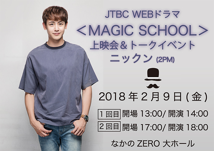 昨年9月に韓国で放送されたニックン(2PM)出演、JTBCドラマ「マジック学校」の上映会&トークイベントイベントが、東京で開催されます。人気アイドルグループ2PMのメンバーでドラマや映画、バラエティ番組など芸能全般で多彩な才能と魅力を見せているニックン。魔術学校に集まった4人の若者の姿を通して疎通と犠牲、理解などメッセージ性の高いドラマとして注目された「マジック学校」ではGOT7のジニョンと共演。ニックンは養子先のアメリカから帰国した医師ジュン役を切なく見事に演じました。このドラマは是々非々を明確にした従来の成長ドラマと違って、ウェブドラマを見る人の視聴方法が様々である点を考慮したナレーション展開とすべてのストーリーにいろんなコメディ要素を取り入れています。2月の上映会ではニックンからドラマの裏話や見どころなどを直接聞いたり、ファンにとって見どころ満載のイベントになります。