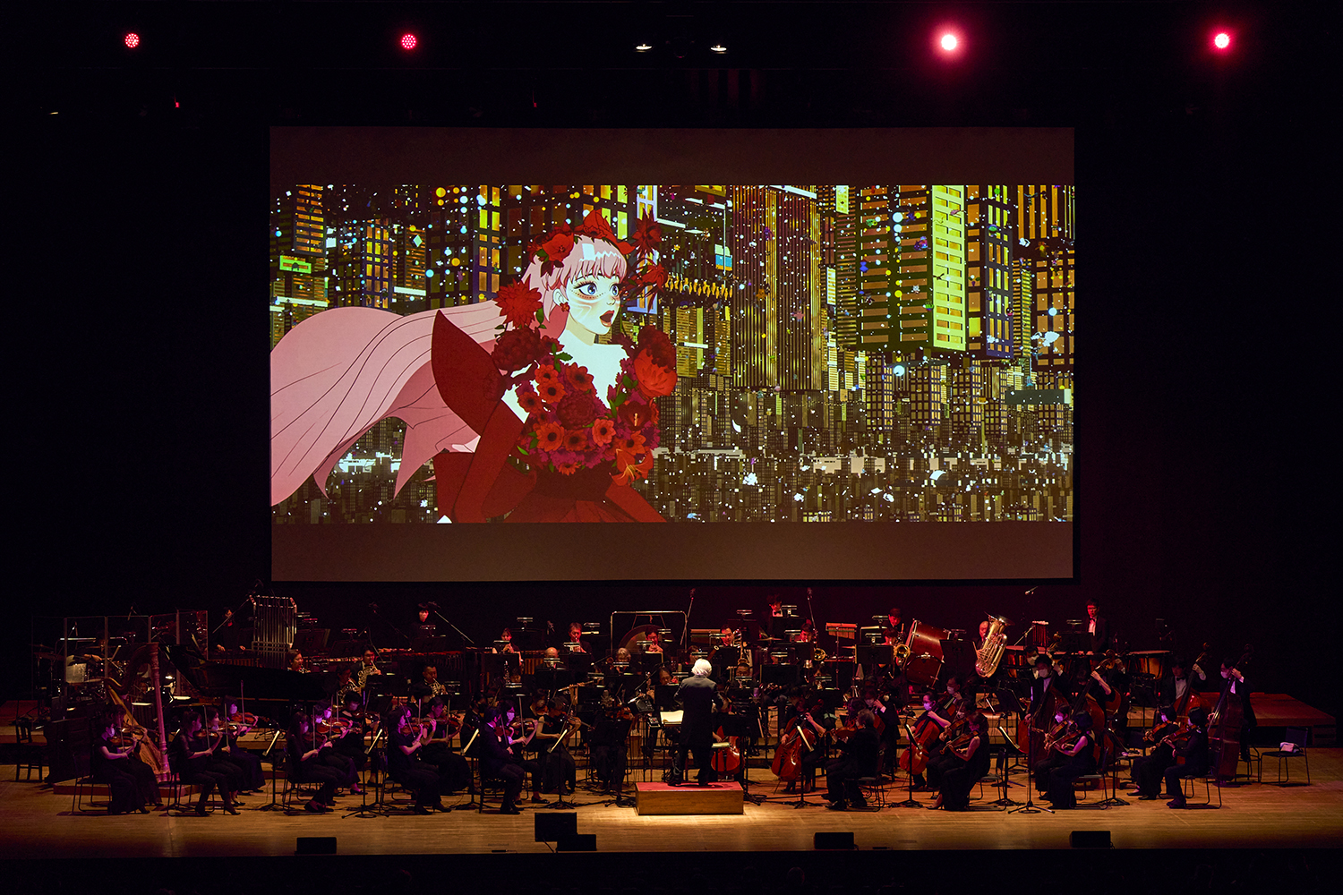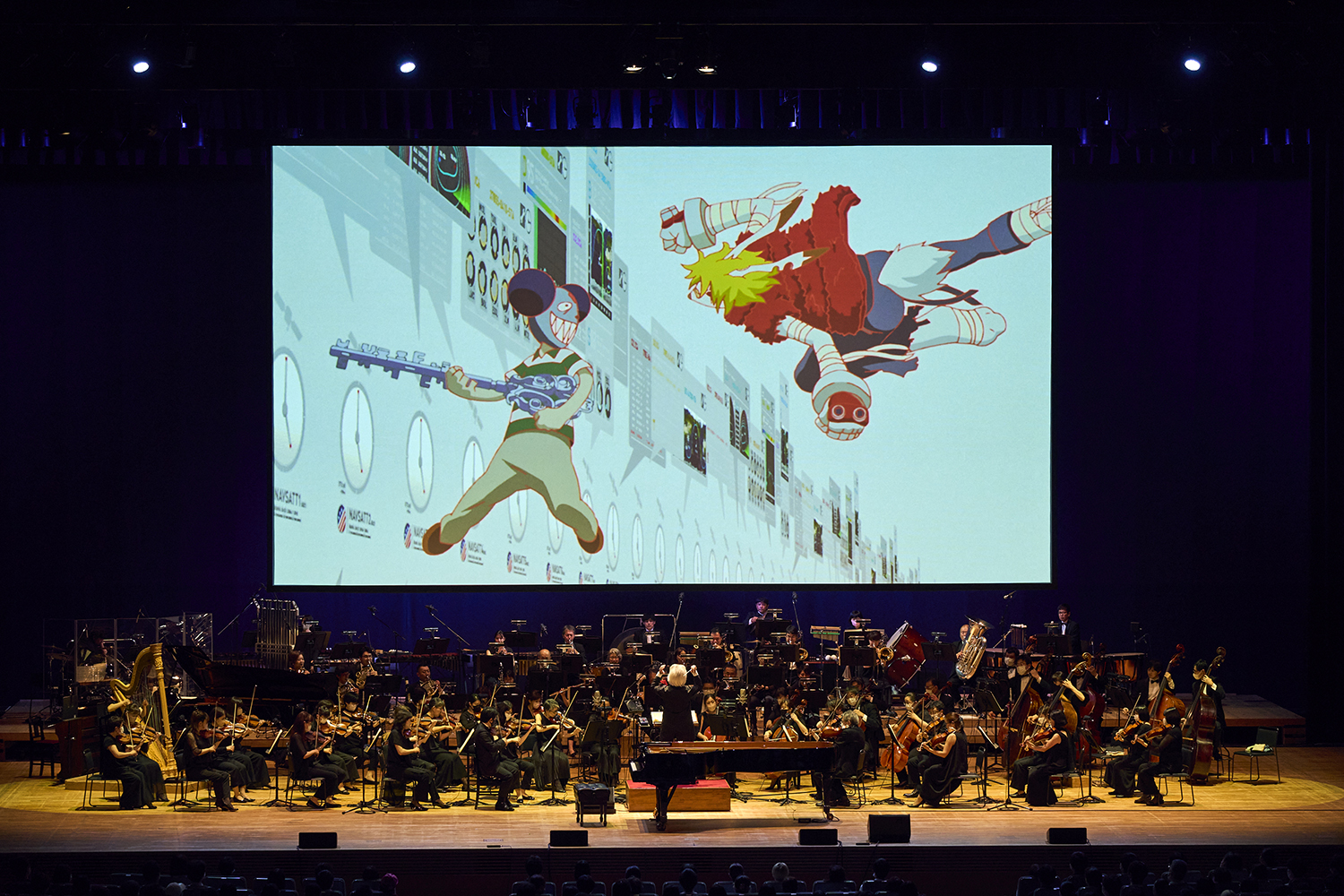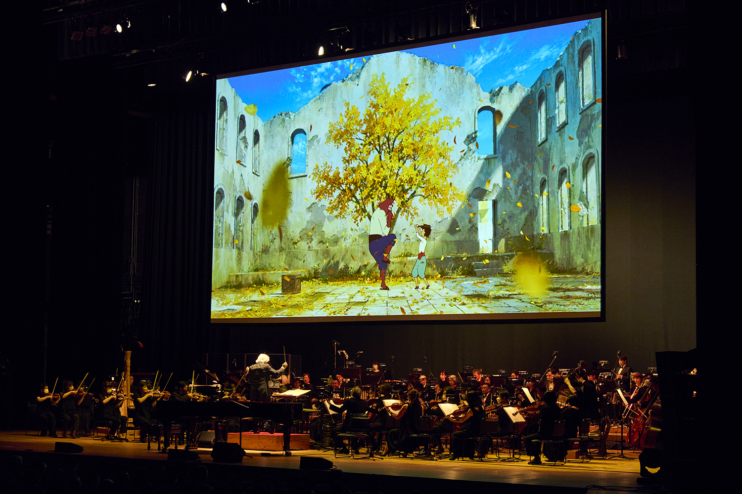 ステージの後ろに設置された大きなスクリーンに炎が映し出され「お前ら本当に困った奴らだな」という多々良の声と共に「祝祭」の演奏が始まる。映画『バケモノの子』とまったく同じオープニングで作品の世界へいざなうと、主人公である九太が、バケモノの世界である“澁天街”に迷い込んだ映像をバックに「三千世界の迷い子」、そこから熊徹と九太の修行のシーンと映し出しながら「充たされた子ども」へ。父の愛を知らなかった九太が、父親代わりでもある熊徹とともに過ごす中で、大事なものを受け取っていく物語を、映像と音楽で伝えていく。最後はハープの美しい音色、弦とピアノの切なさから一気に盛り上がっていく「胸の剣」。大迫力の映像と音楽で物語のクライマックスを表現していくのは爽快だった。